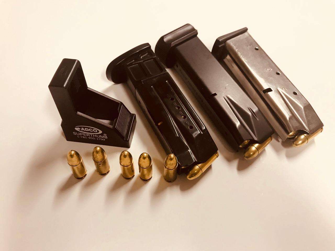 The Super Thumb ST1 magazine loading tool fits most double stack magazines, including: Astra A80/A90; Beretta Px4/92/96/Cougar 8000/8040; Bersa Ultra Compact Pro 9/40/45; Browning Hi Power; Colt 2000/Gov’t model; CZ 75; FNP 9; HK USP; IMI Baby Eagle; IWI Jericho; Kel-Tec 9/40; SCCY 9mm; Sig Sauer 226/228/320; S&W 59/Sigma/M&P 9/40; Springfield XDS/XDM/XD40; Star 28/30/31; Steyr Mod. M/Mod. 9; Taurus PT92/111/917; Ruger SR9; Walther P99. The Super Thumb ST1 measures 21.5mm x 32.5mm.